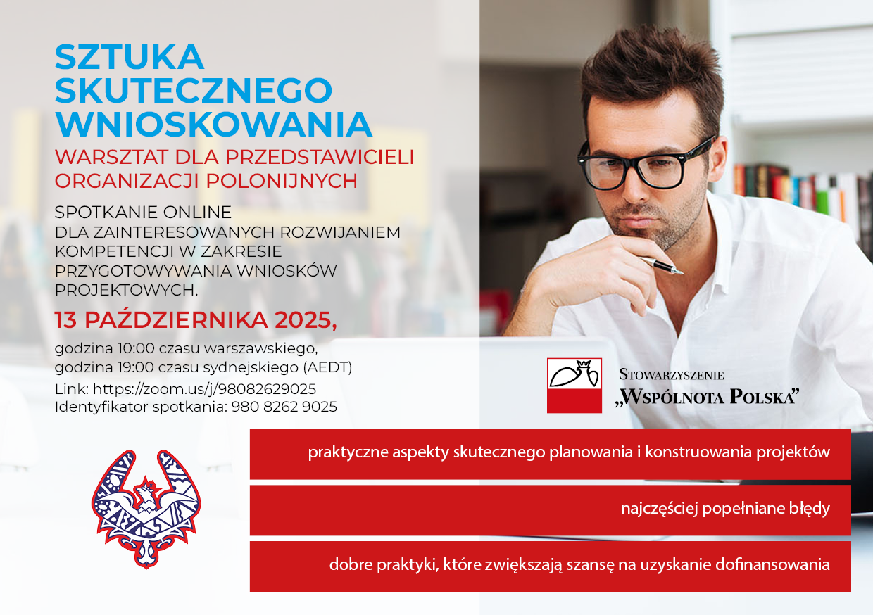 W imieniu Stowarzyszenia „Wspólnota Polska” serdecznie zapraszam Państwa na spotkanie online pn. „Sztuka skutecznego wnioskowania - warsztat dla przedstawicieli organizacji polonijnych”, które odbędzie się 13 października 2025 r., o godz. 10:00 czasu polskiego.
